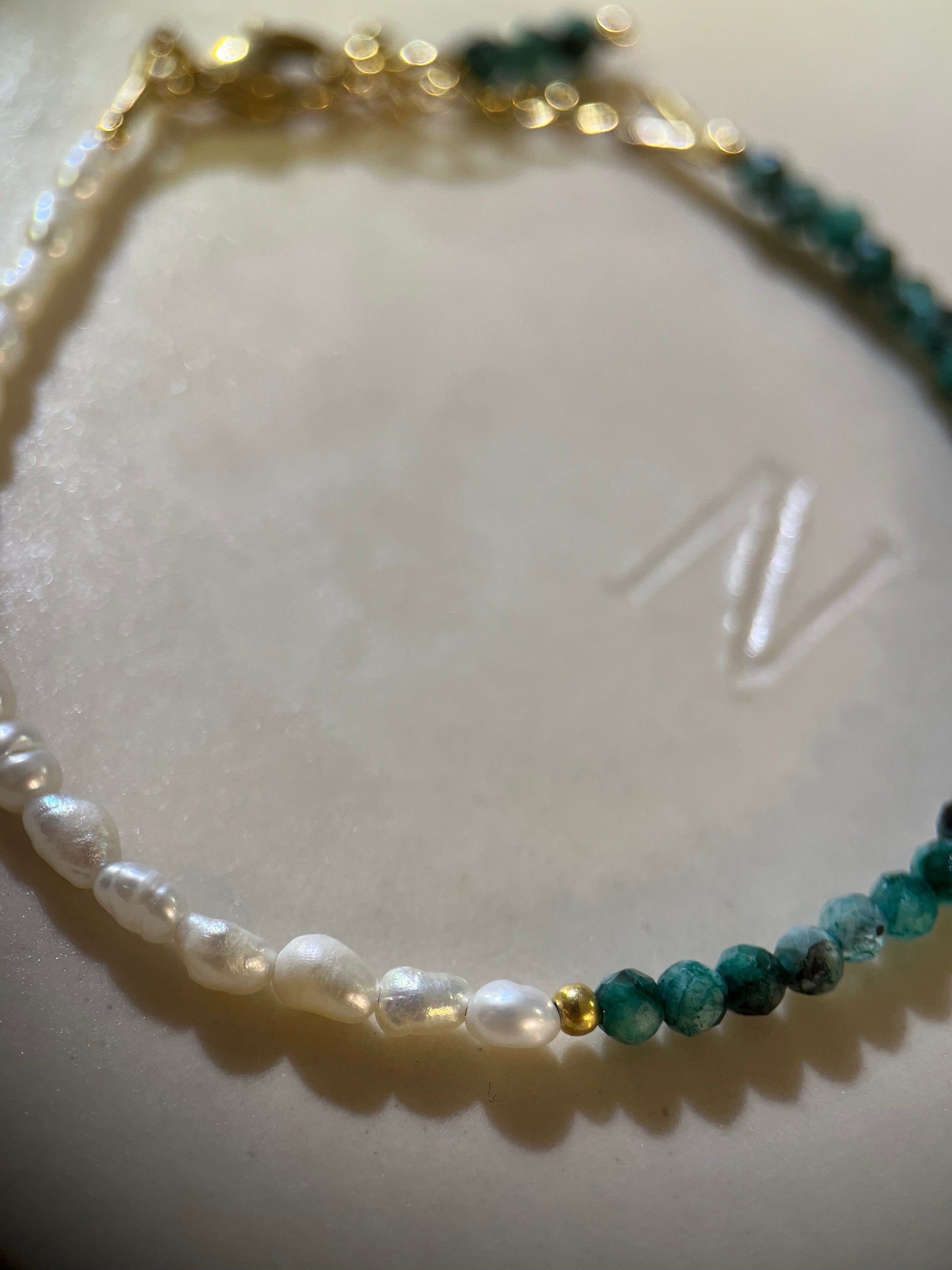 Longueur de 14cm + 3cm d’extension. Perles d’eau douce et labradorite verte. Les composants sont en acier inoxydable et en or laminé.